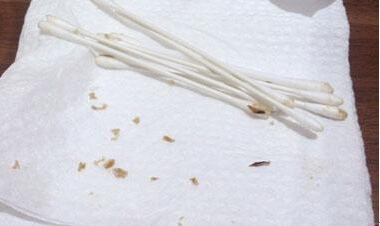 第四步:三分钟后,凡士林会软化硬硬的耳垢,用幼儿细棉棒轻轻用旋转的方式挑出来。结果就是这样。。。。